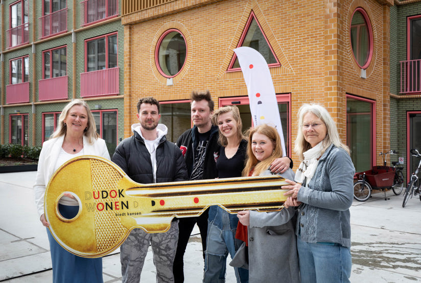 V.l.n.r: Jacqueline van Ham (bestuurder Dudok Wonen), nieuwe bewoners Jasper, Kiki en Britney, en wethouder Jacqueline Kalk
