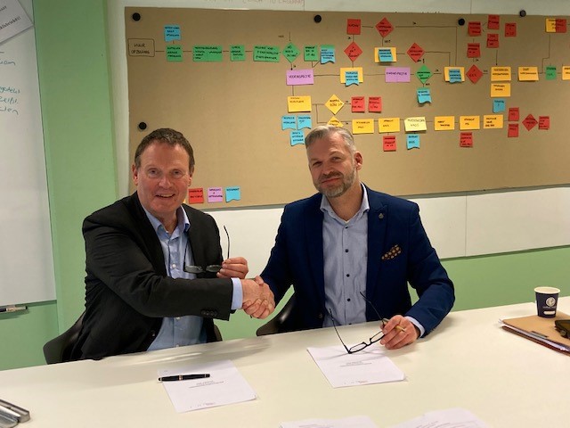 Ondertekenaars zijn directeur Ruurd Kramer van Slokker Bouwgroep (rechts op de foto) en directeur Robert Jan Sliep (links op de foto) van Dudok Wonen.