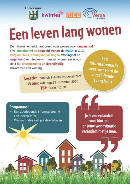 Zaterdag 25 november is er een informatiemarkt "Een leven lang wonen" in de burgerzaal van het Raadhuis in Hilversum. De informatiemarkt gaat over wonen in de verschillende levensfases. Bekijk de onderstaande flyer voor meer informatie. Neem voor vragen contact op met Gemeente Hilversum, Kwintes, MEE of Versa Welzijn.